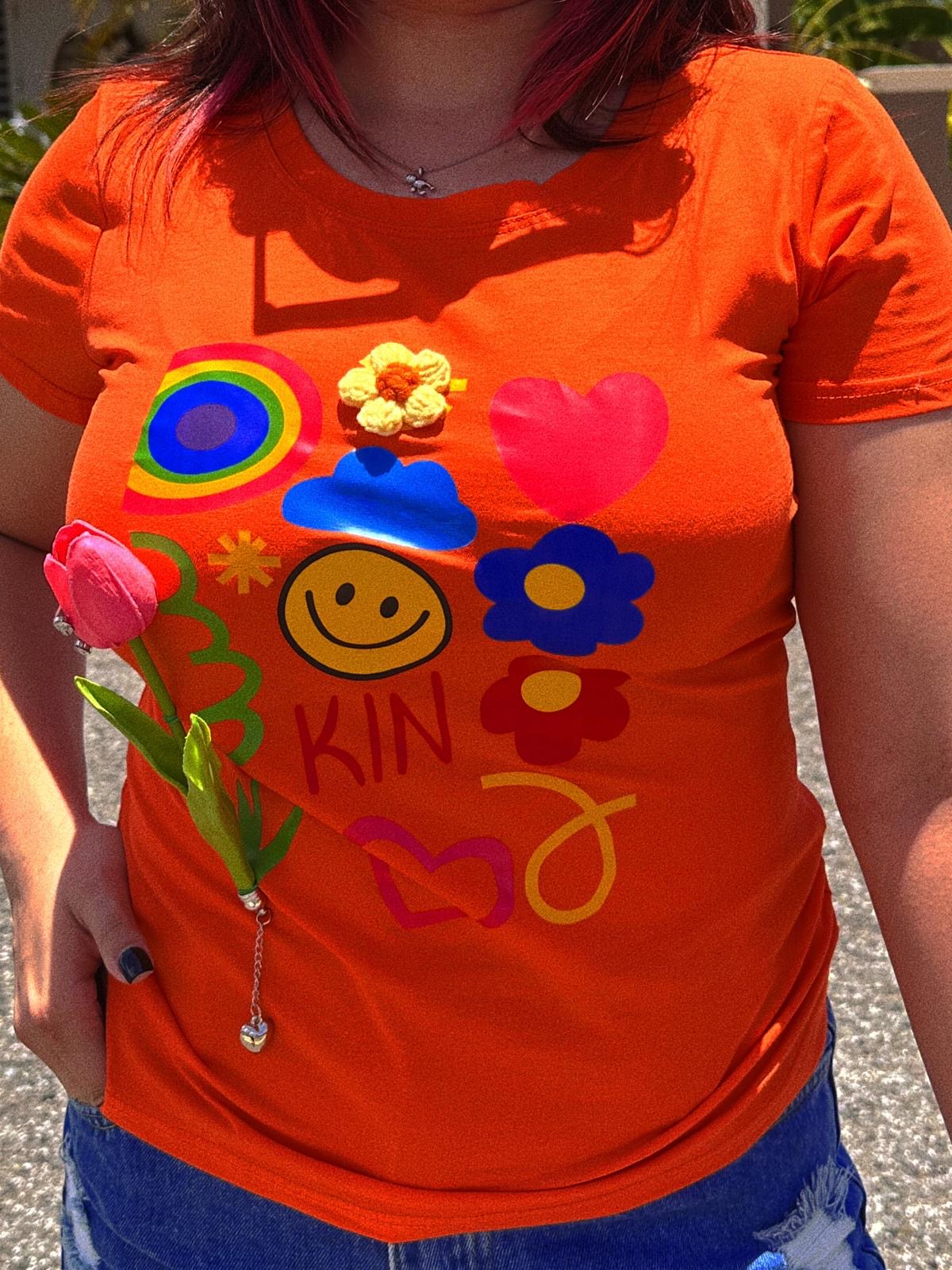 Camiseta vibrante y divertida disponible en naranja y fucsia. Decorada con un diseño colorido que incluye un smiley, corazones, flor tejida y un tulipán a relieve. Perfecta para quienes buscan un estilo alegre y único. Llénate de energía positiva y originalidad.