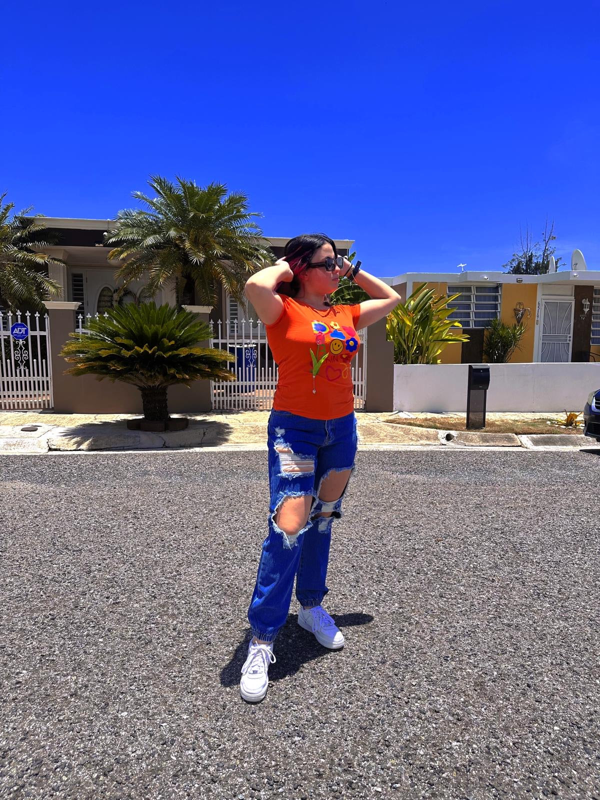 Modelo en segunda foto (blusa naranja) lo lleva puesto large (size regular de pantalón es 10)